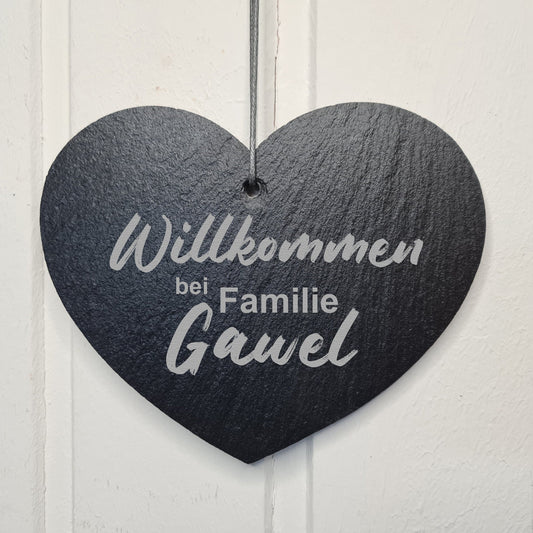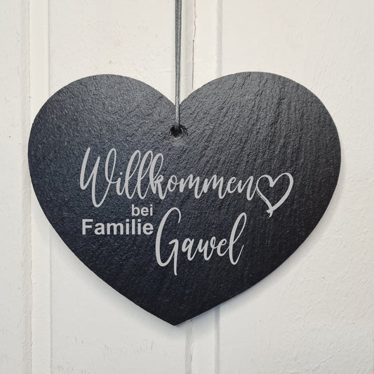 Schieferherz Willkommen - personalisiert mit Name, Familienname - Design 2