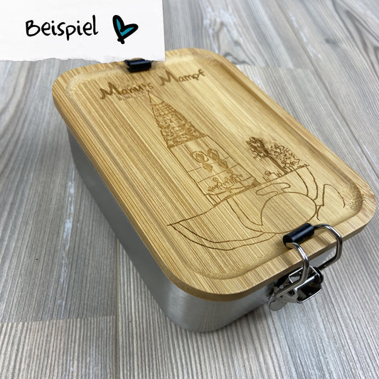 Der Bambusdeckel sorgt nicht nur für einen natürlichen Look, sondern ist auch praktisch und leicht zu reinigen. Die Dose ist aus Edelstahl und darf sogar in die Spülmaschine. Zudem kannst du die Brotdose mit einer individuellen Gravur personalisieren, um sie zu einem einzigartigen Geschenk für Freunde oder Familie zu machen.