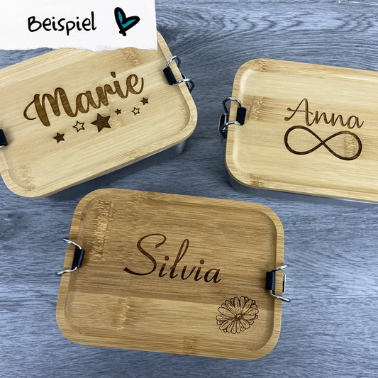 Lunchbox "Name Schreibschrift" aus Edelstahl mit Bambusdeckel, personalisiert mit Name und Wunschmotiv