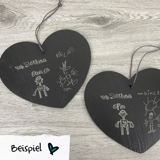 Schieferherz Kinderkunstwerk, verschiedene Größen - Kinderzeichnung im Original graviert