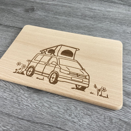 Brettchen Camper mit Dachzelt - mit Name personalisiert, Campingplatz Wimmelbild für Kinder