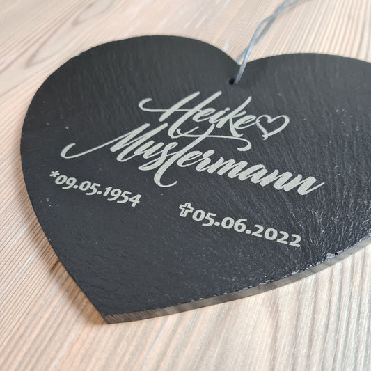 Schieferherz, Gedenktafel personalisiert - Wunschgravur mit Name und Daten