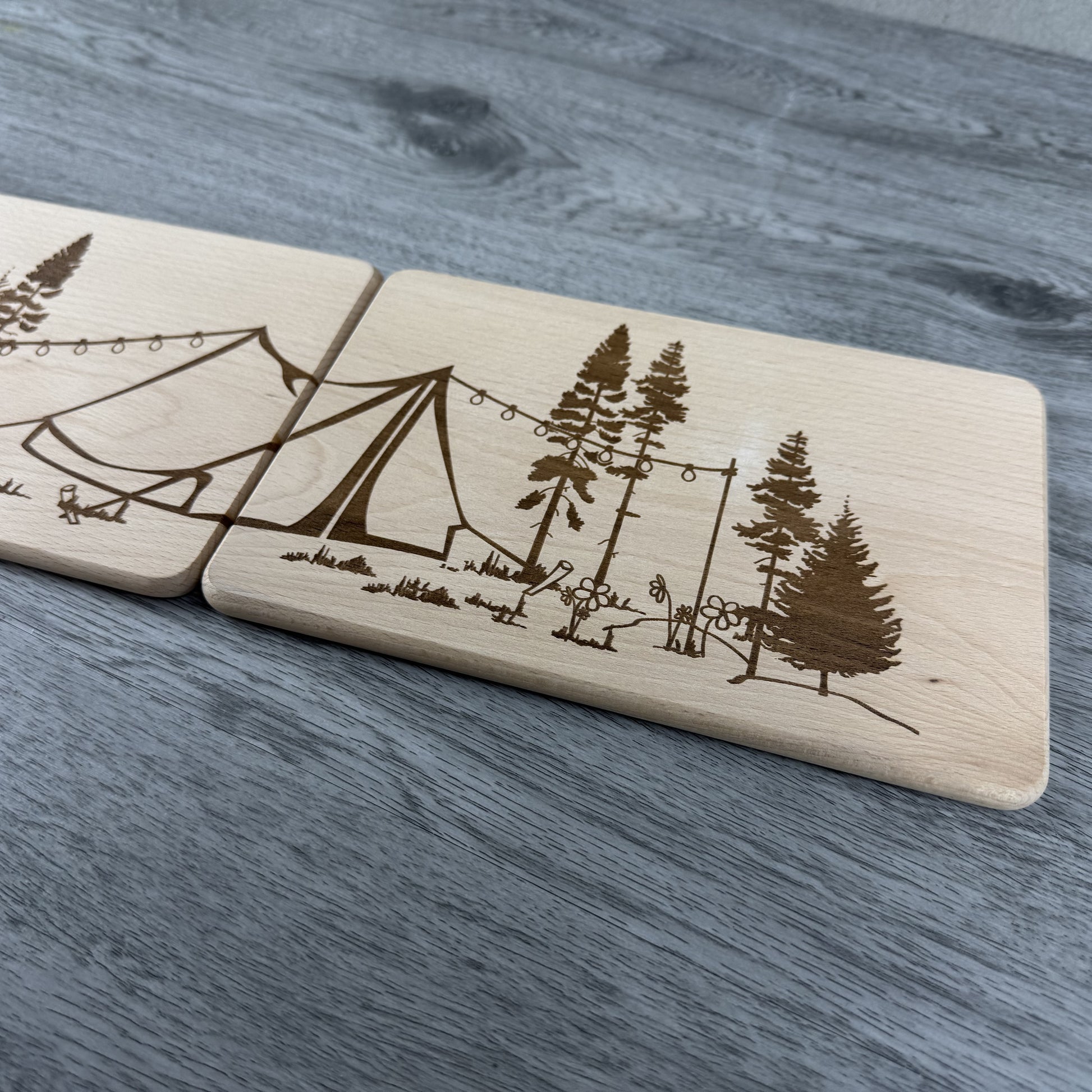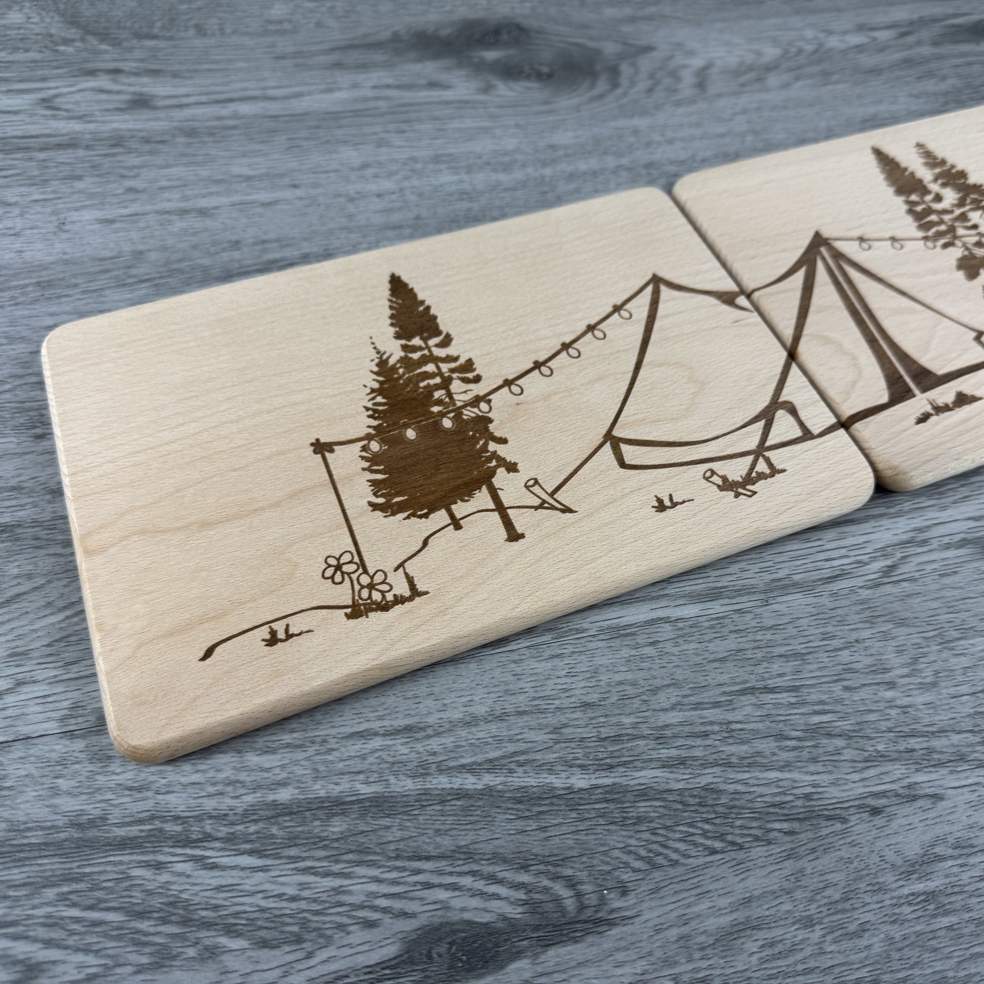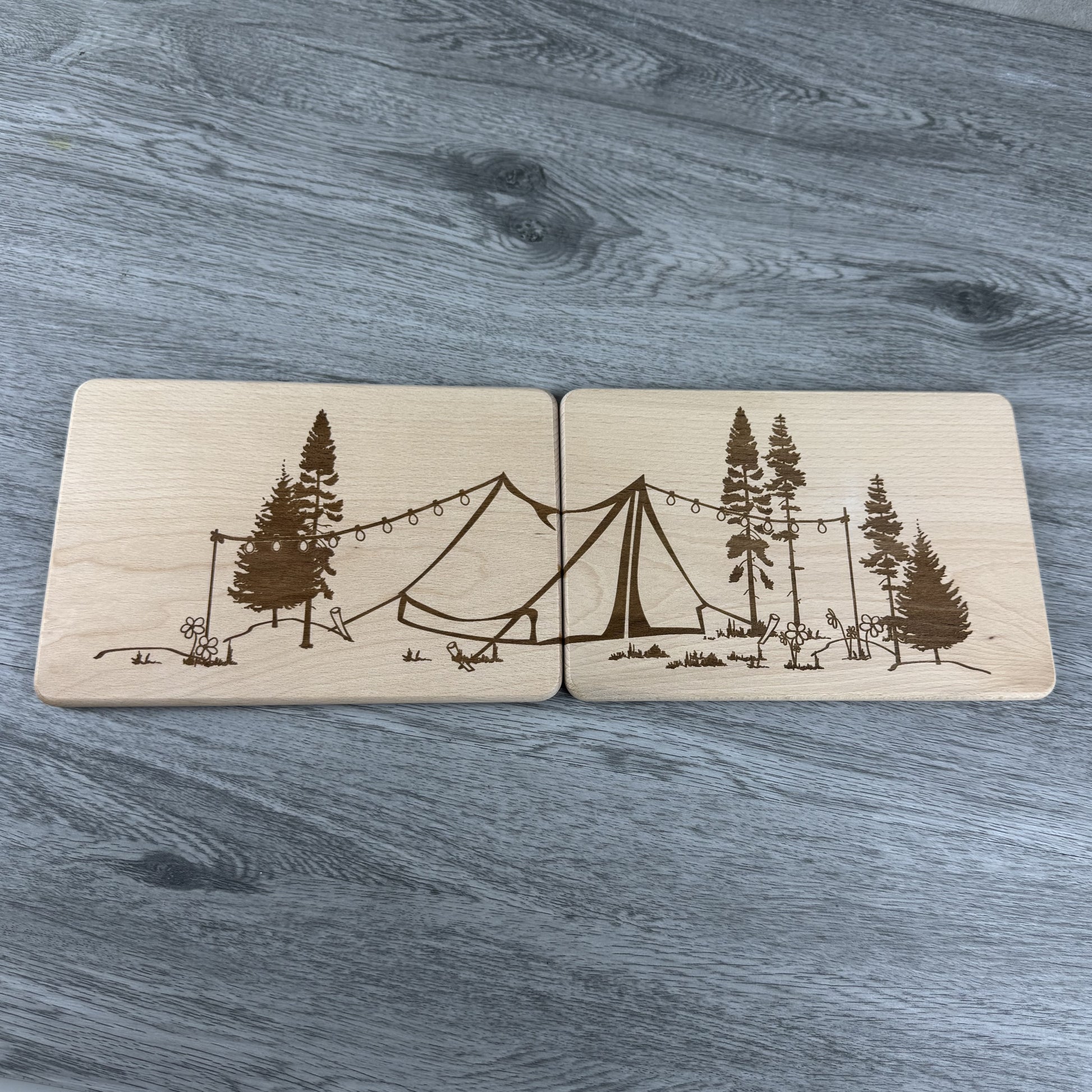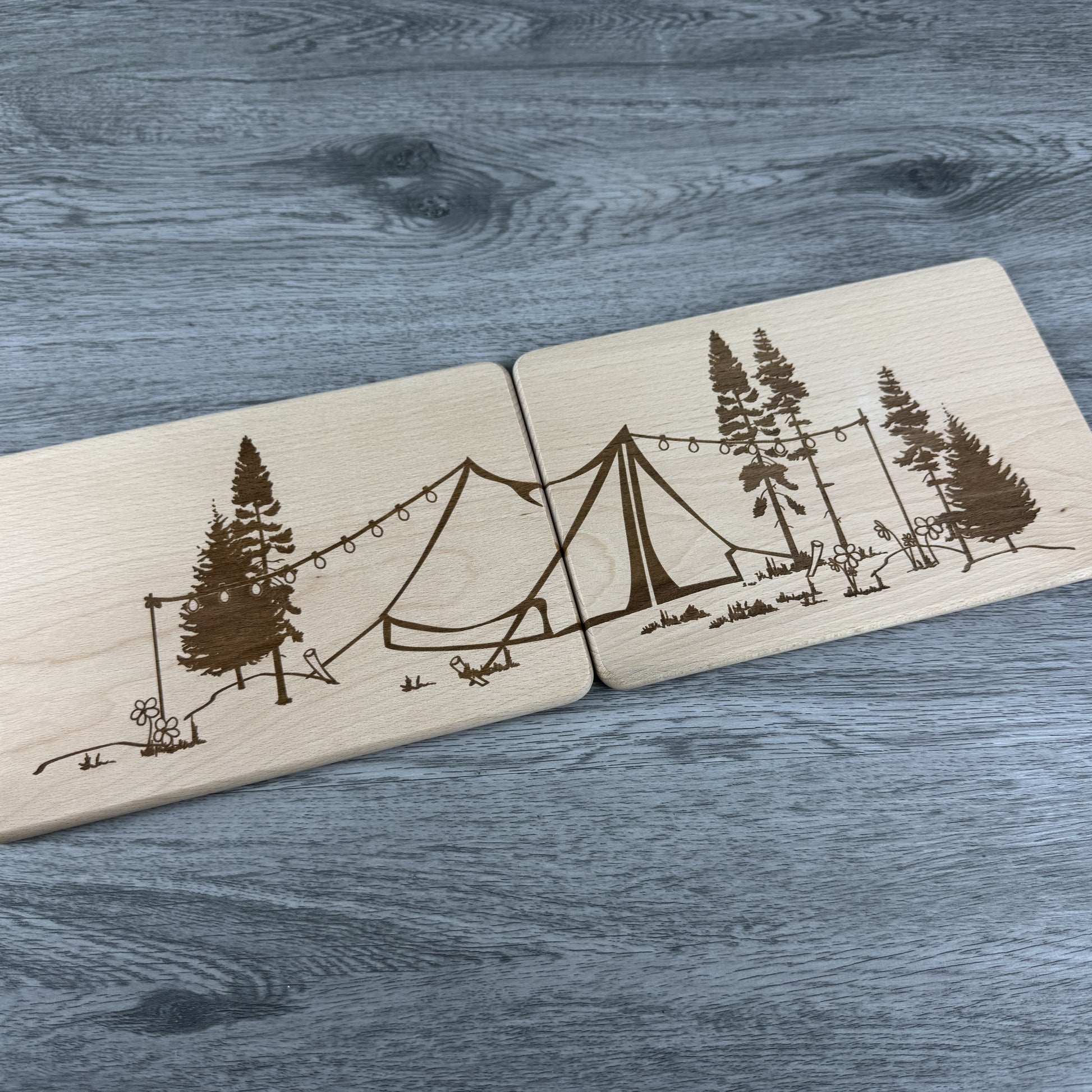 - Motiv: Camping-Szene mit Zelten, Lichterkette & Bäumen - geteilt auf zwei Brettchen